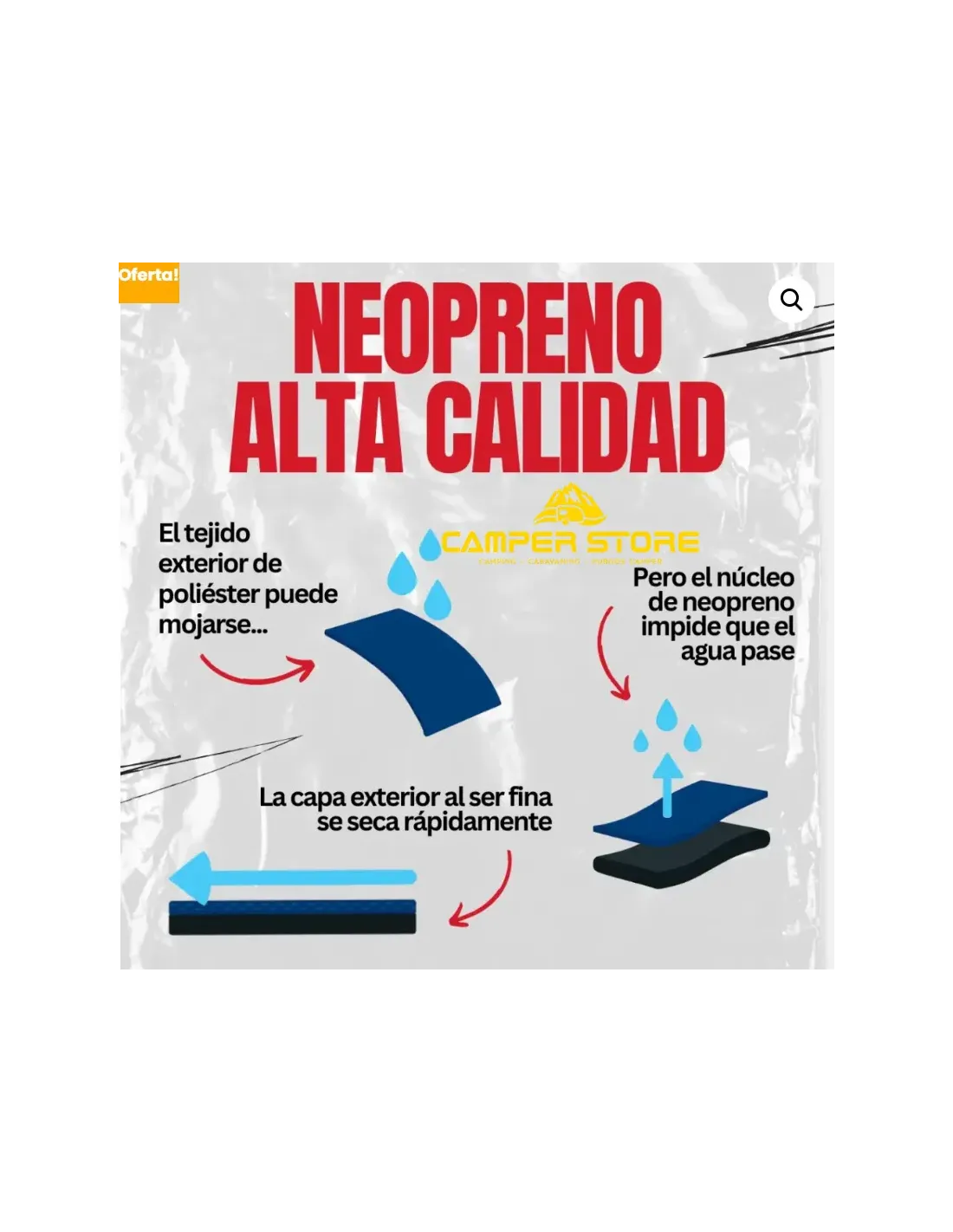 Tejido exterior e interior 100% poliéster 75D y núcleo 100% neopreno de alta calidad.