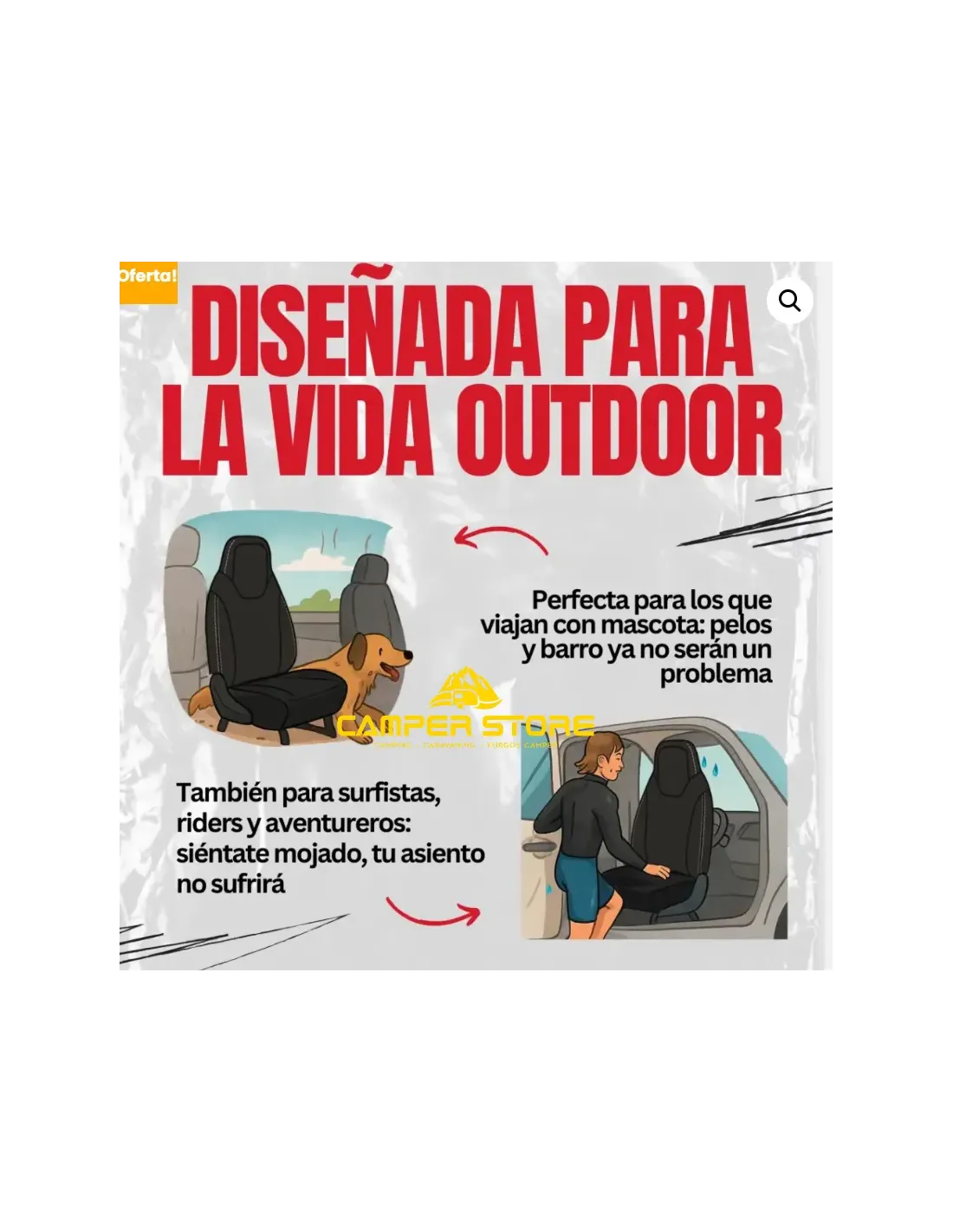 Funda de asiento impermeable universal en neopreno elástico, ideal para deportes acuáticos, aventuras outdoor o viajar con mascotas.