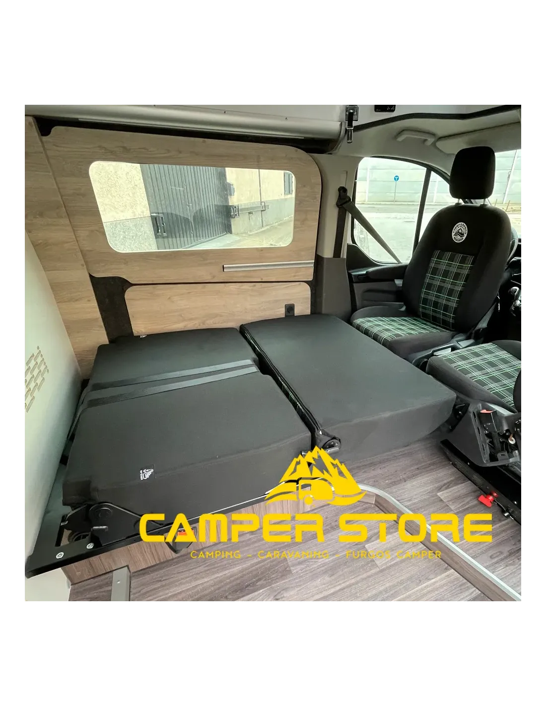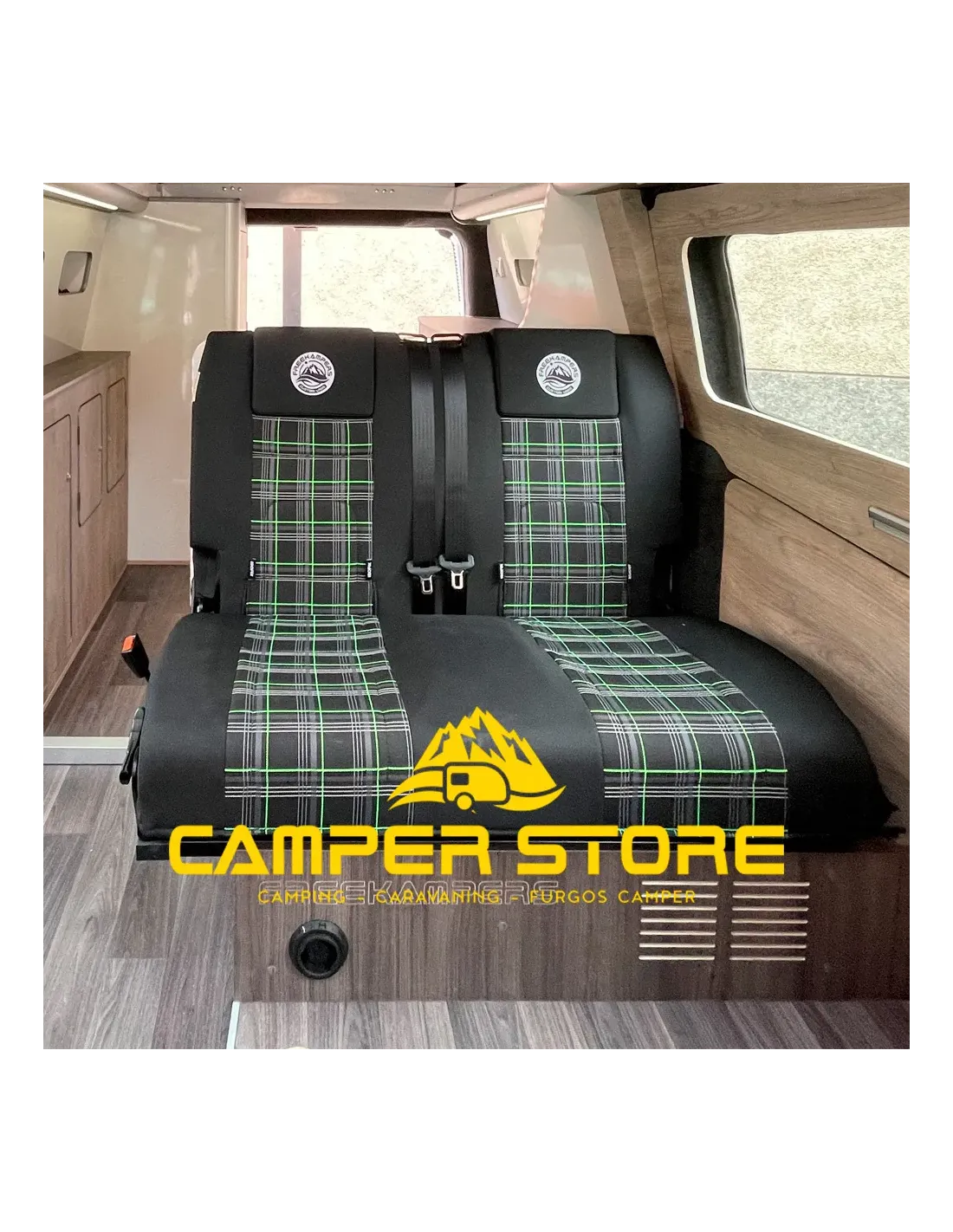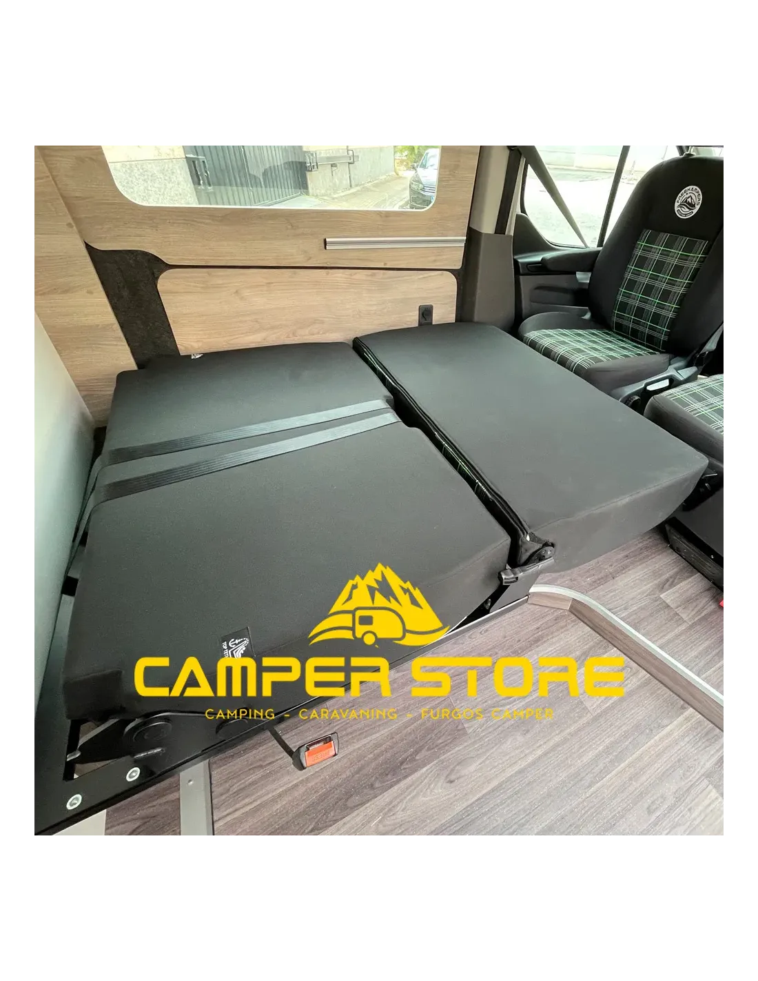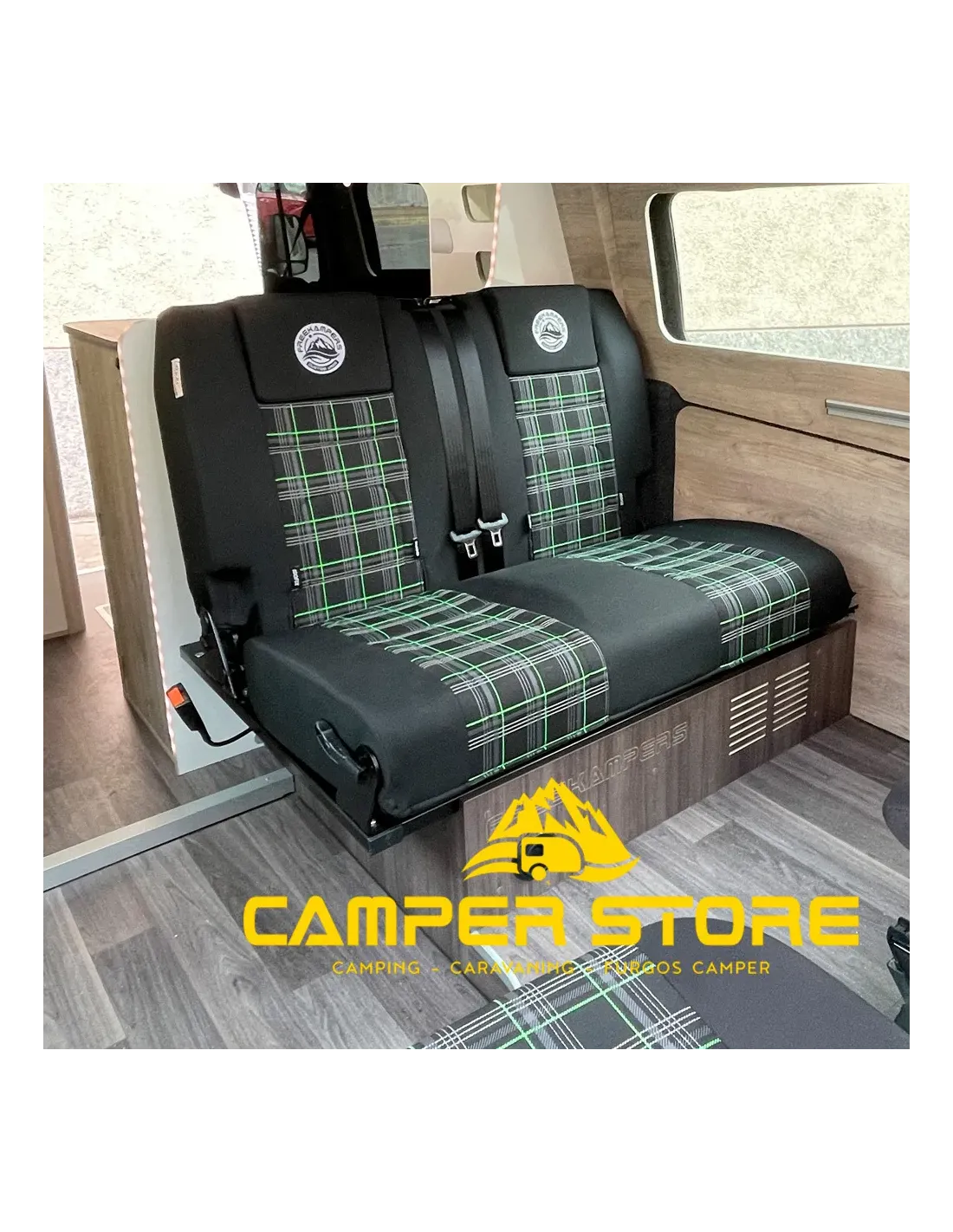 Asiento cama fijo dos plazas 104 cms, con cinturones, Isofix y reposacabezas. Homologable (consulta a tu ingeniero con tu ficha técnica).