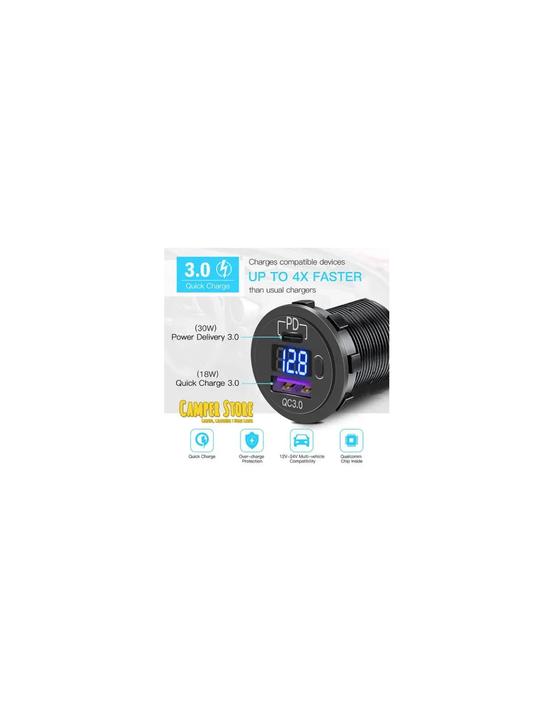 Toma doble de USB con voltímetro digital y tapa. Todo en una simple toma, de esta forma ahorras tener que añadir más.