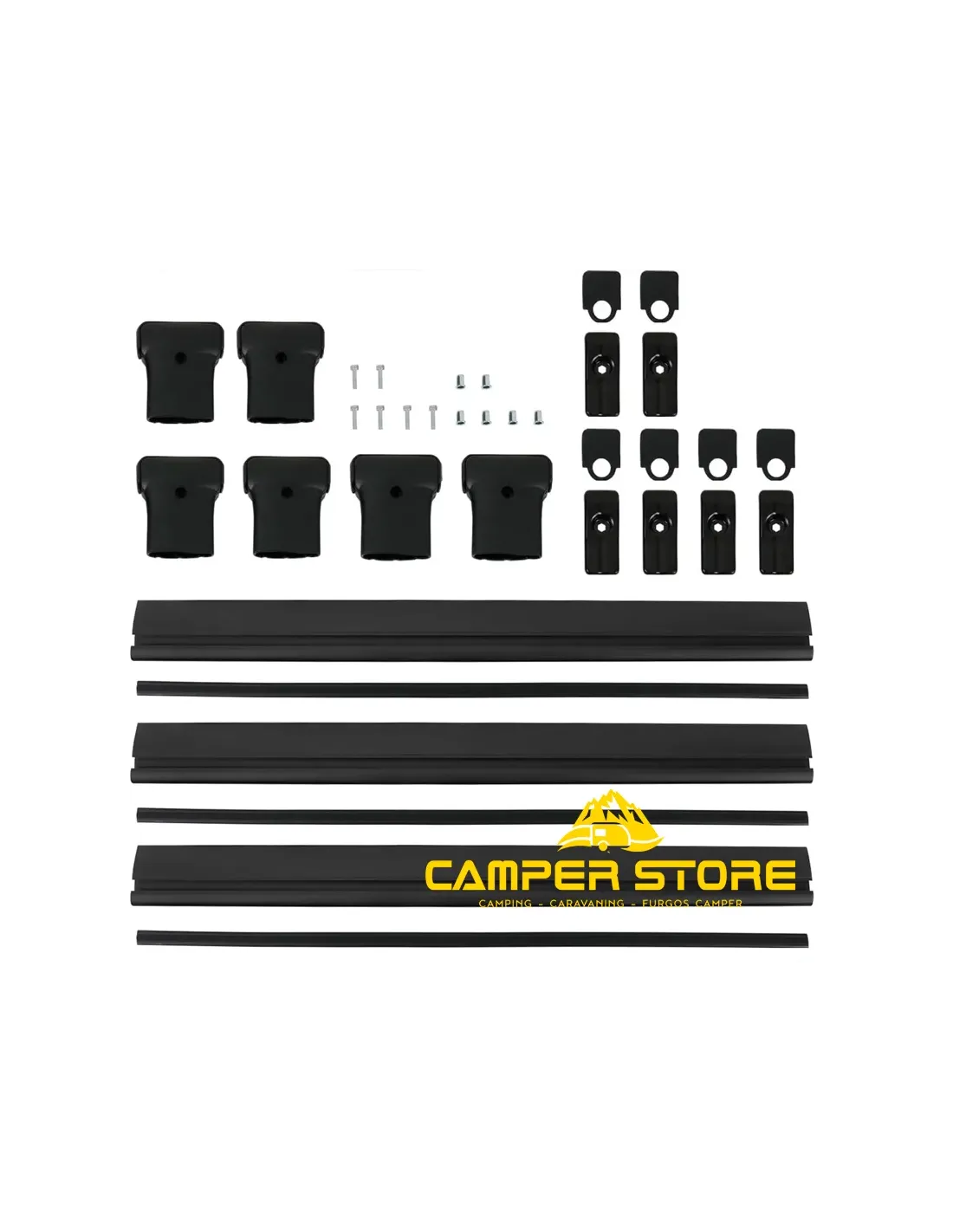 Contenido de la caja: 3 travesaños, abrazaderas y otros componentes de montaje.