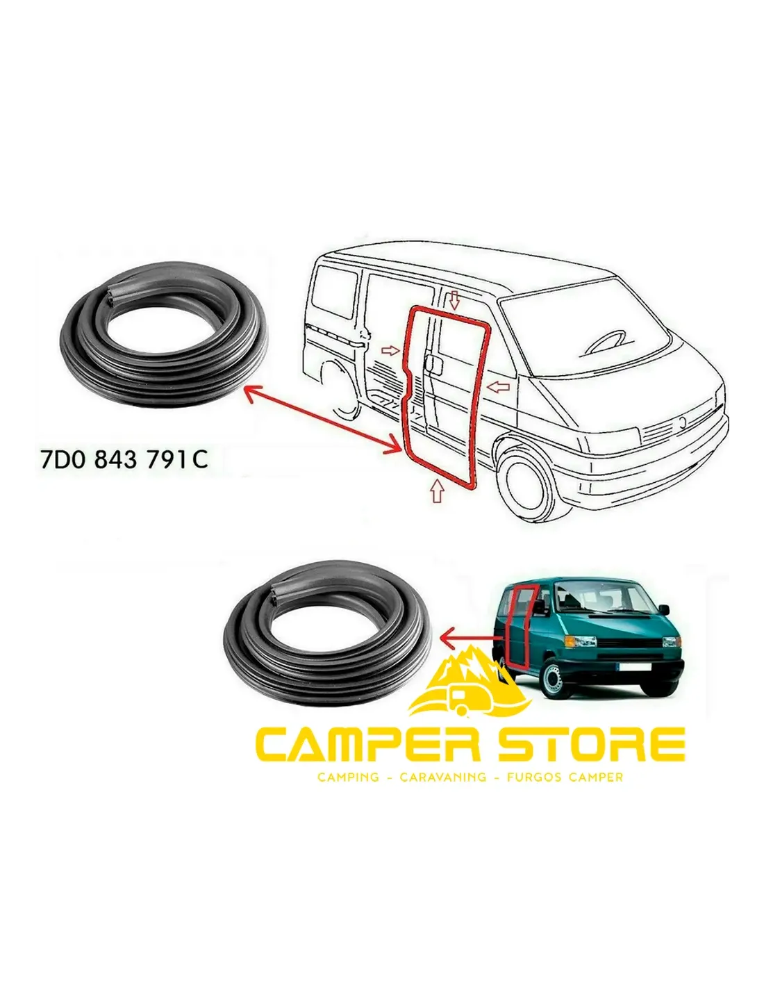 Esta goma de contorno para la puerta corredera lateral es totalmente compatible con furgonetas Volkswagen T4 (Transporter, Caravelle, Multivan y California). Aunque no es una pieza original, su calidad y ajuste son prácticamente idénticos al OEM, a un precio mucho más competitivo.