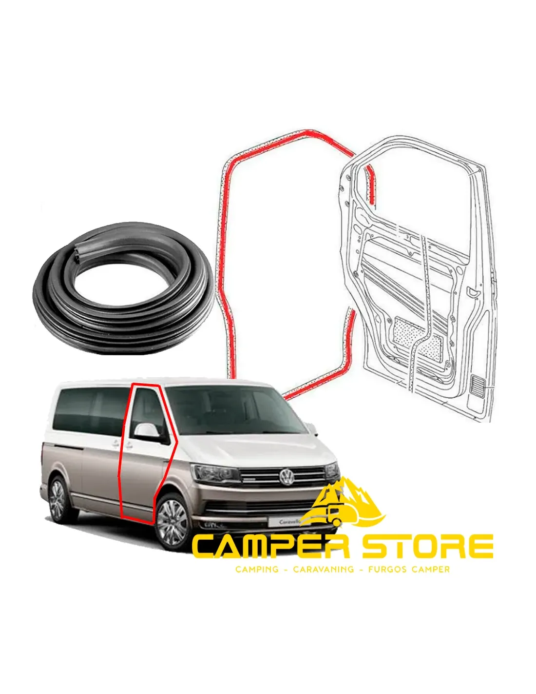Esta goma de contorno para la puertas delanteras es totalmente compatible con furgonetas Volkswagen T5 y T6 (Transporter, Caravelle, Multivan y California). Aunque no es una pieza original, su calidad y ajuste son prácticamente idénticos al OEM, a un precio mucho más competitivo.